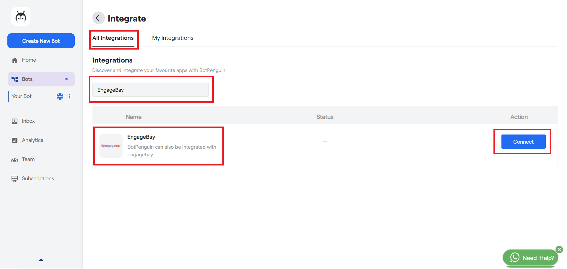Login to your BotPenguin account, and select the Bot you want to integrate with EngageBay.