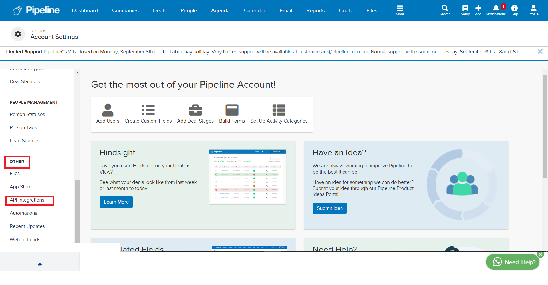 Under Admin Settings, scroll down to the Other Tab and click on API Integrations.