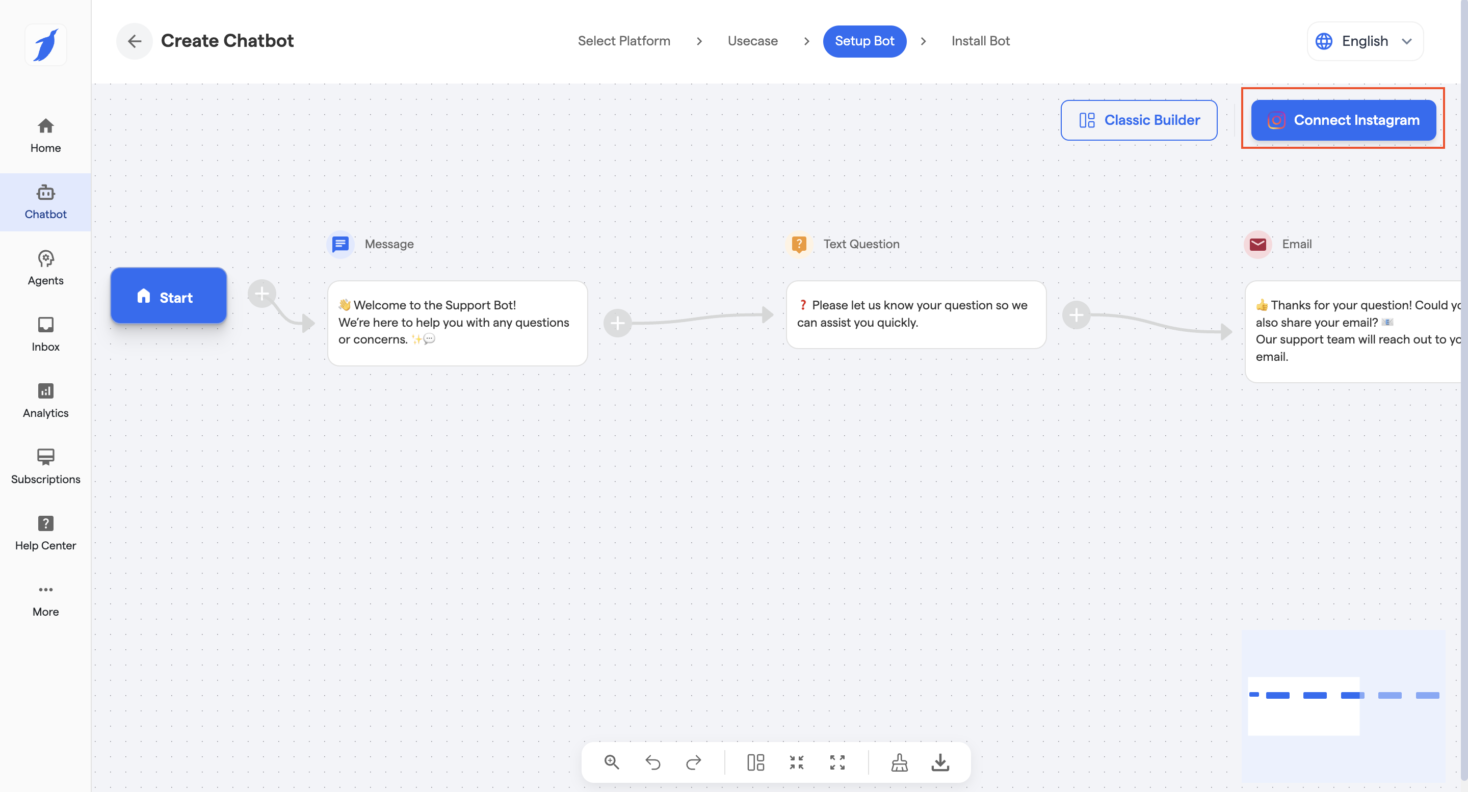 4. Configure the chatflow of your Instagram Chatbot, and customize it to your design. Use the below page to customize your flow.