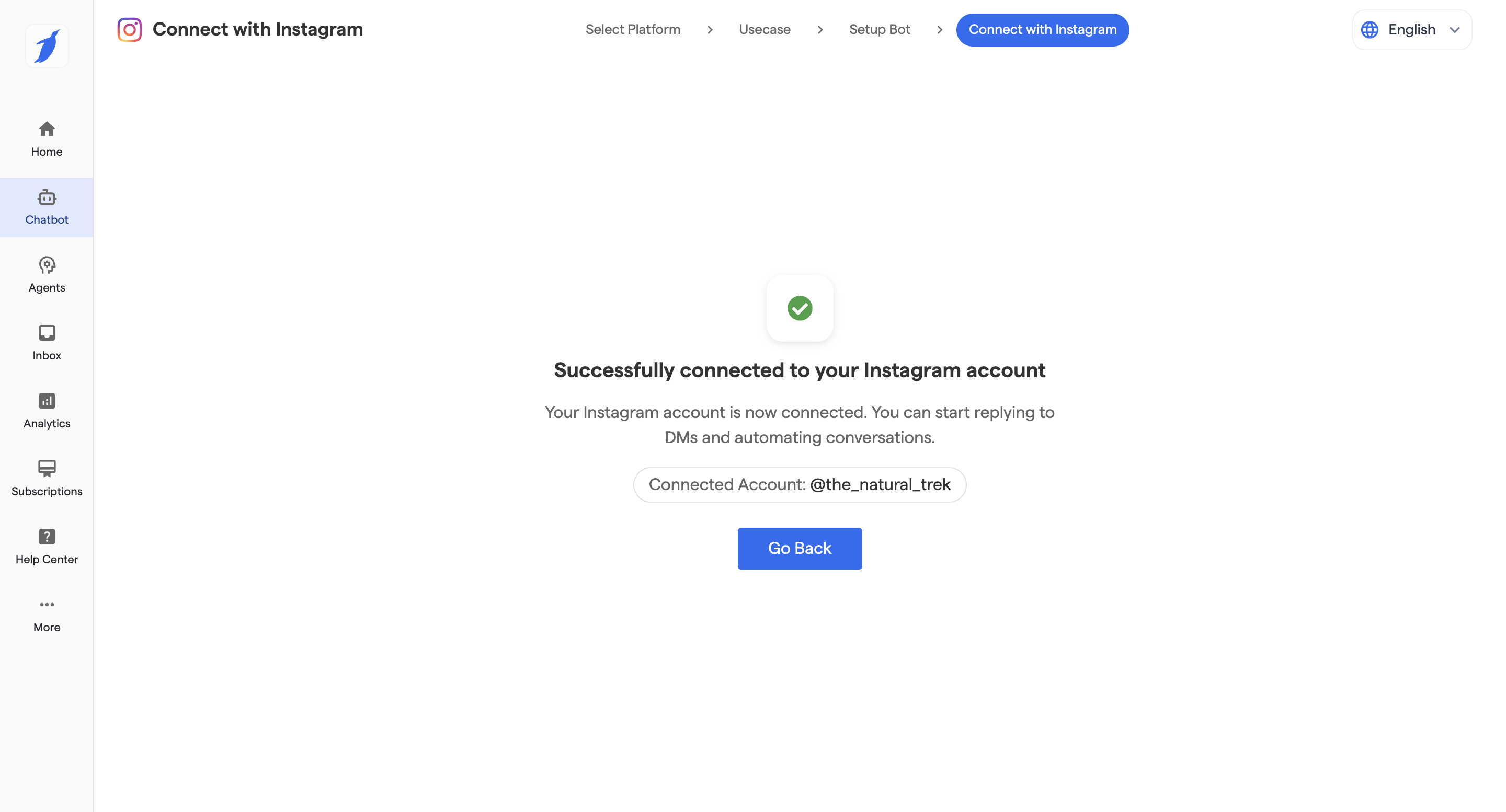 8. When all the permissions are added, your Instagram Account will be connected to your chatbot!&#x20;