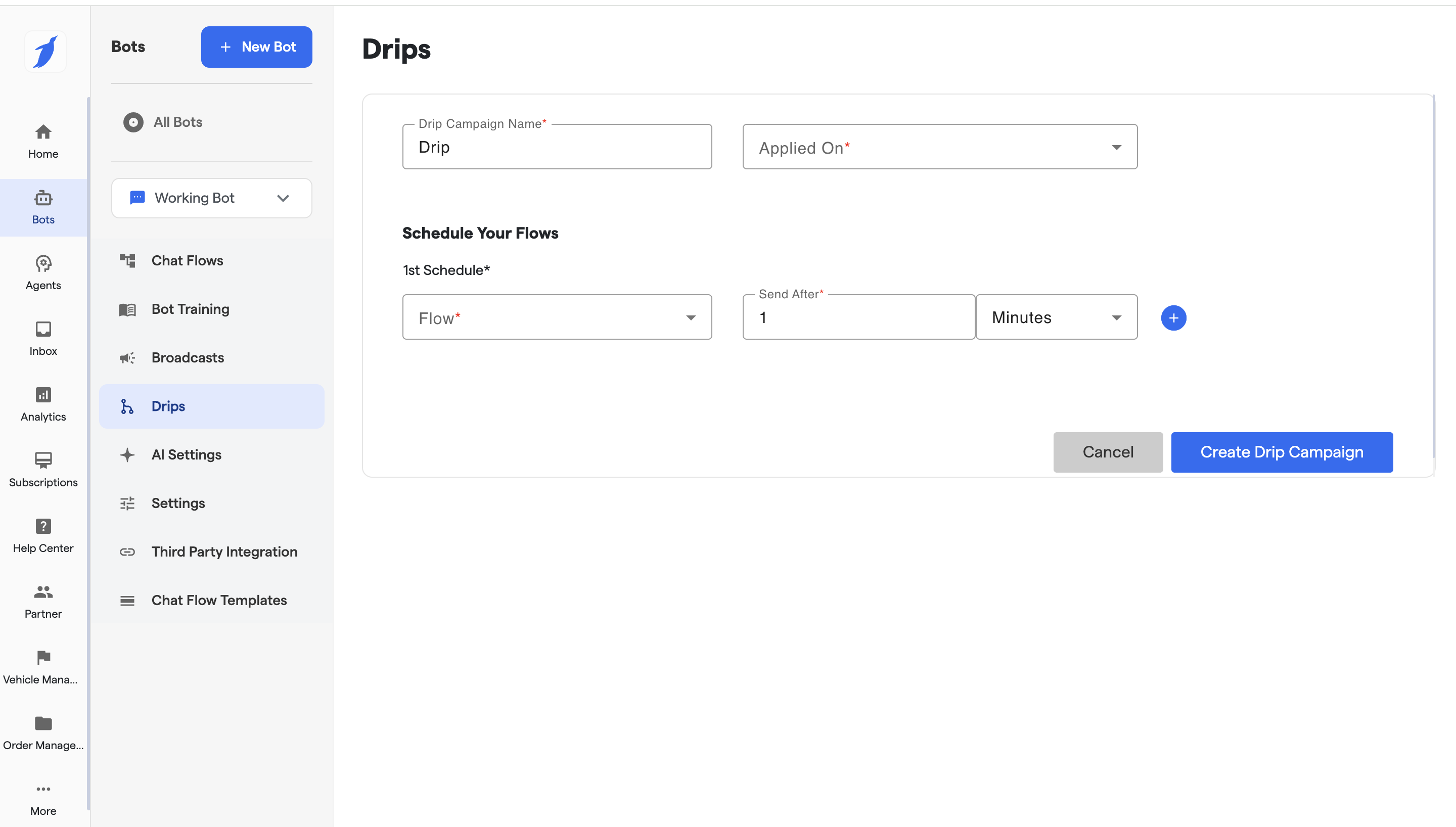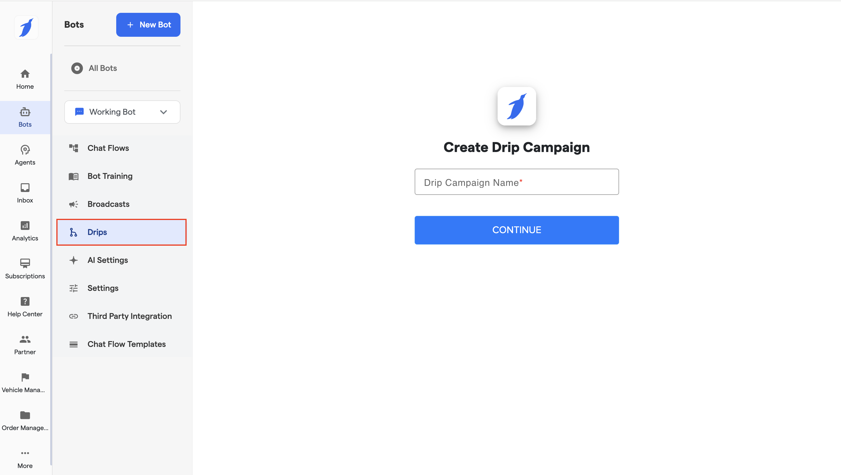 A Drip Campaign is a scheduled and structured flow of messages created for customer onboarding journeys. You can define which messages to be sent or can create the whole onboarding journey using the timeline-based messages and chat flow. It only applies to the new customers starting their conversation with the bot.