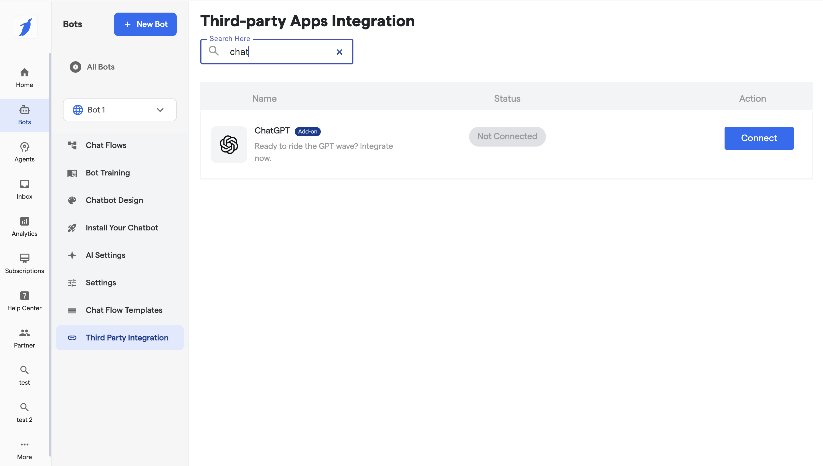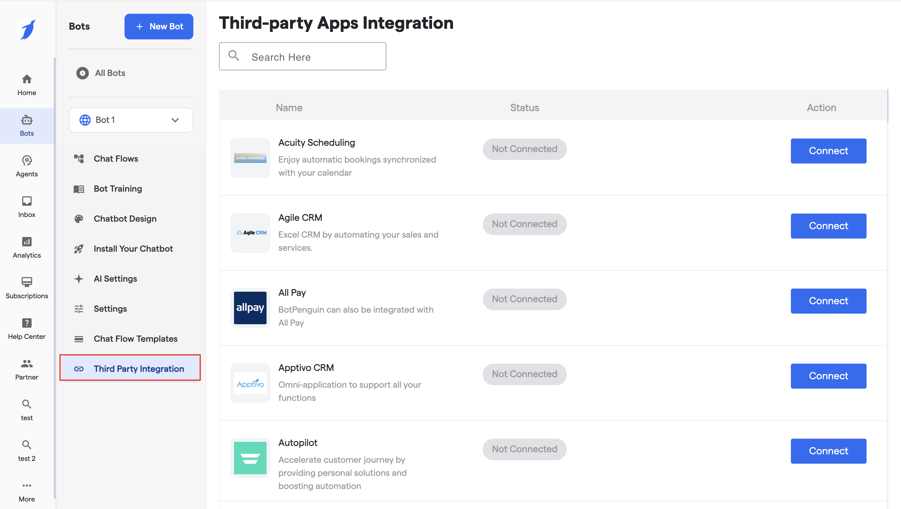 1. Login to your BotPenguin account. Then, select and click the Bot you want to integrate with ChatGPT. Click on the **"Third Party Apps Integration"**