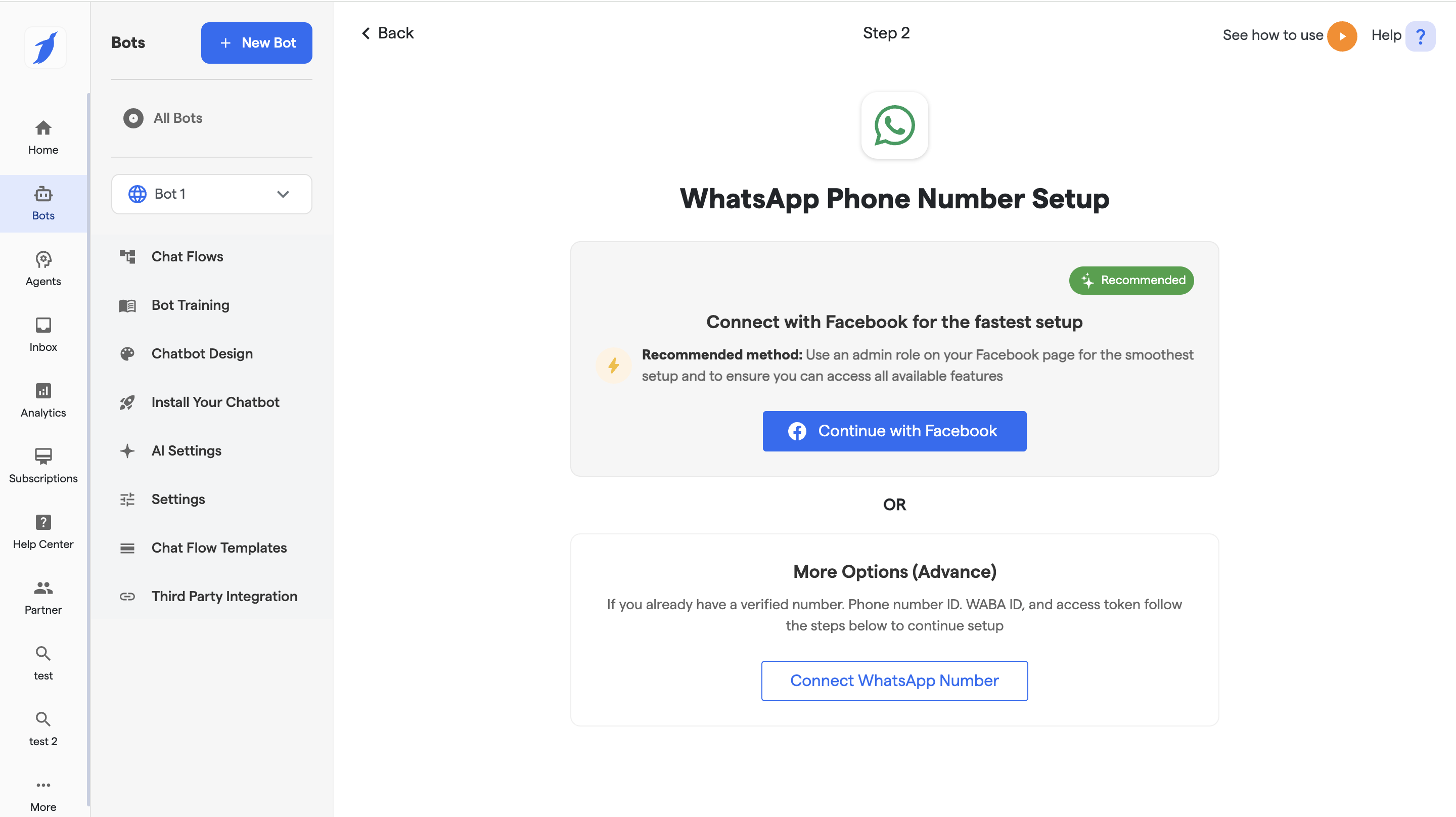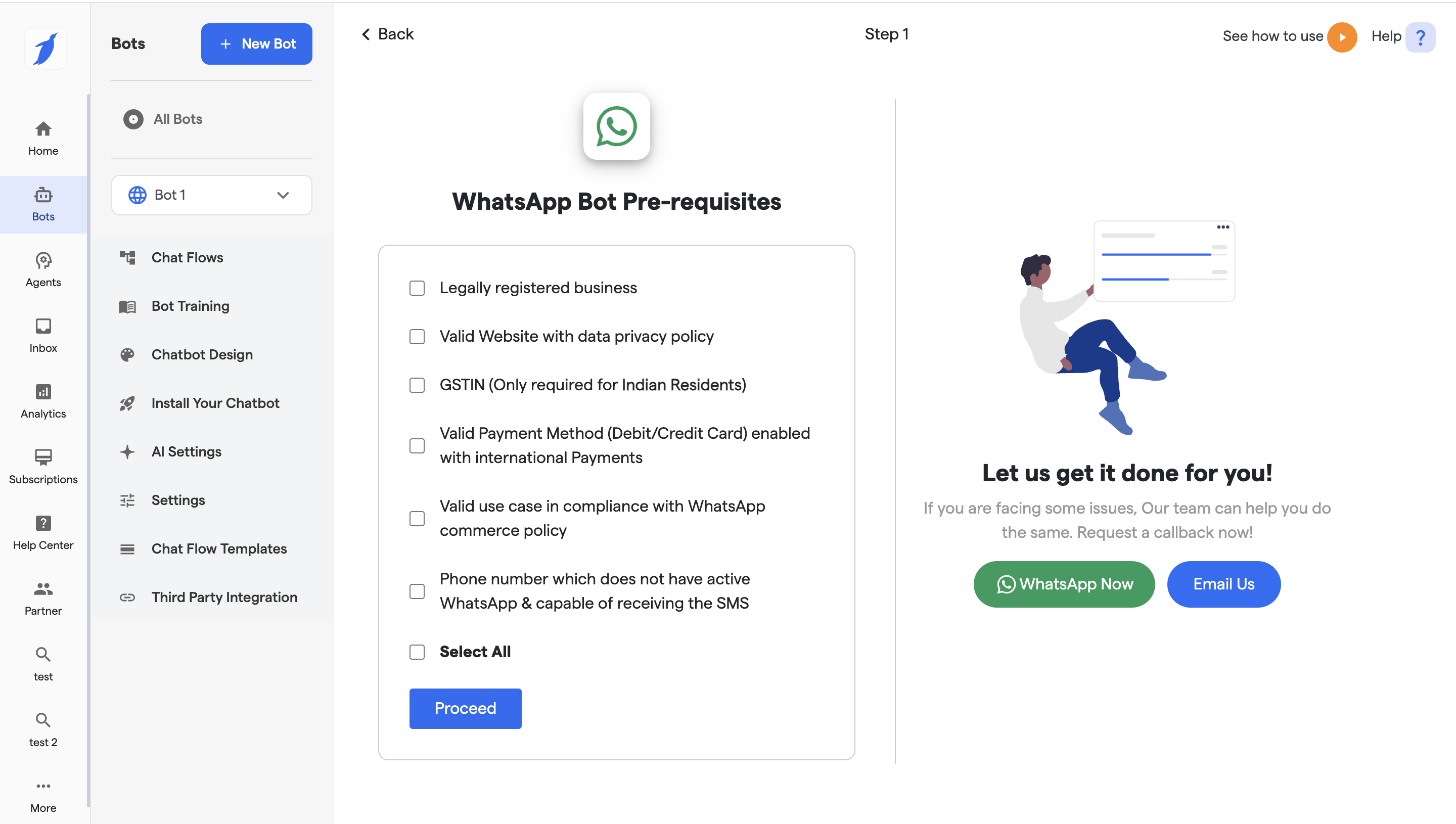 ### **Step 2:** Create a WhatsApp bot & go through the WhatsApp Automated onboarding process <a href="#step-2-create-a-whatsapp-bot-and-go-through-the-whatsapp-automated-onboarding-process" id="step-2-create-a-whatsapp-bot-and-go-through-the-whatsapp-automated-onboarding-process"></a>