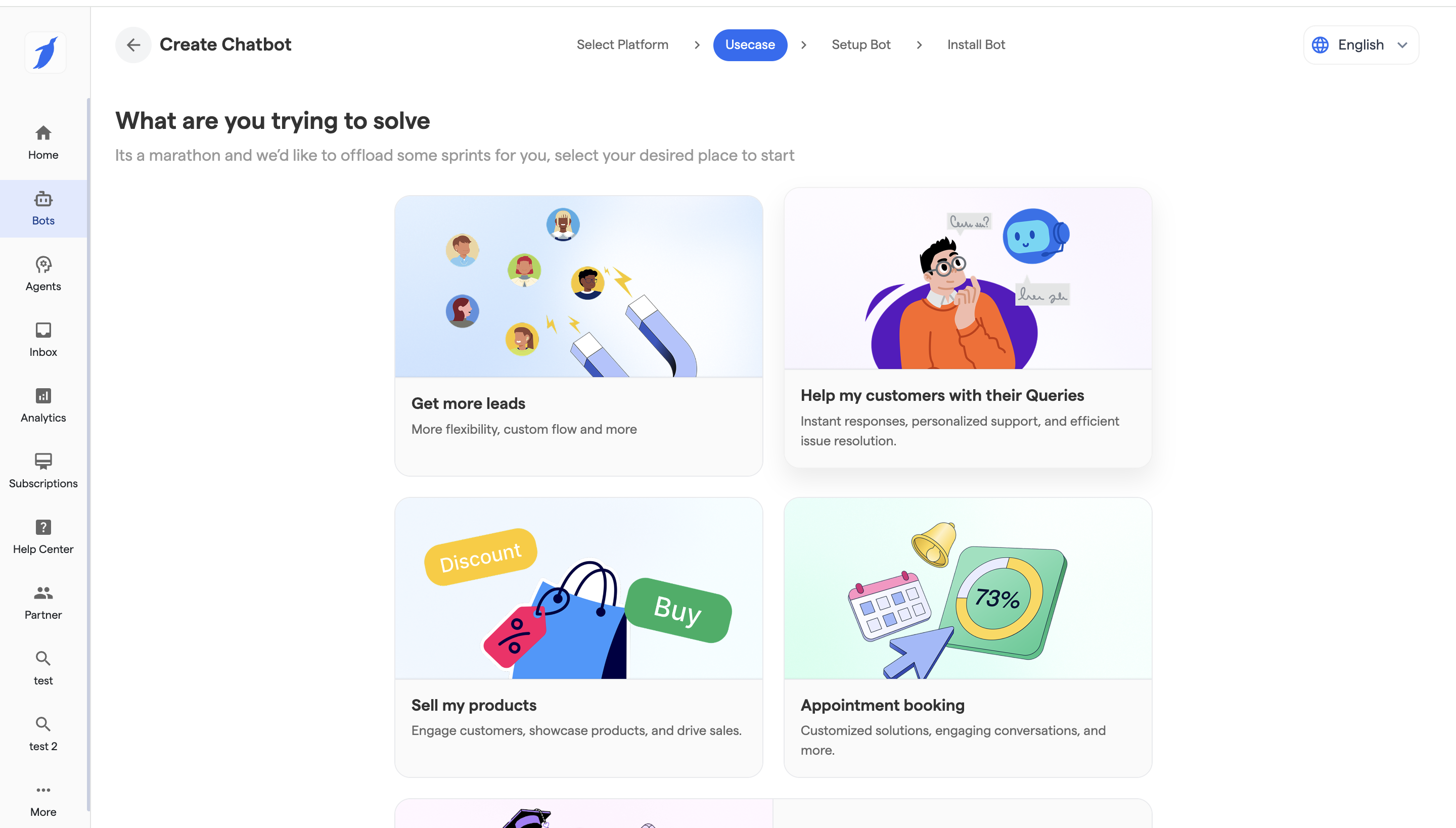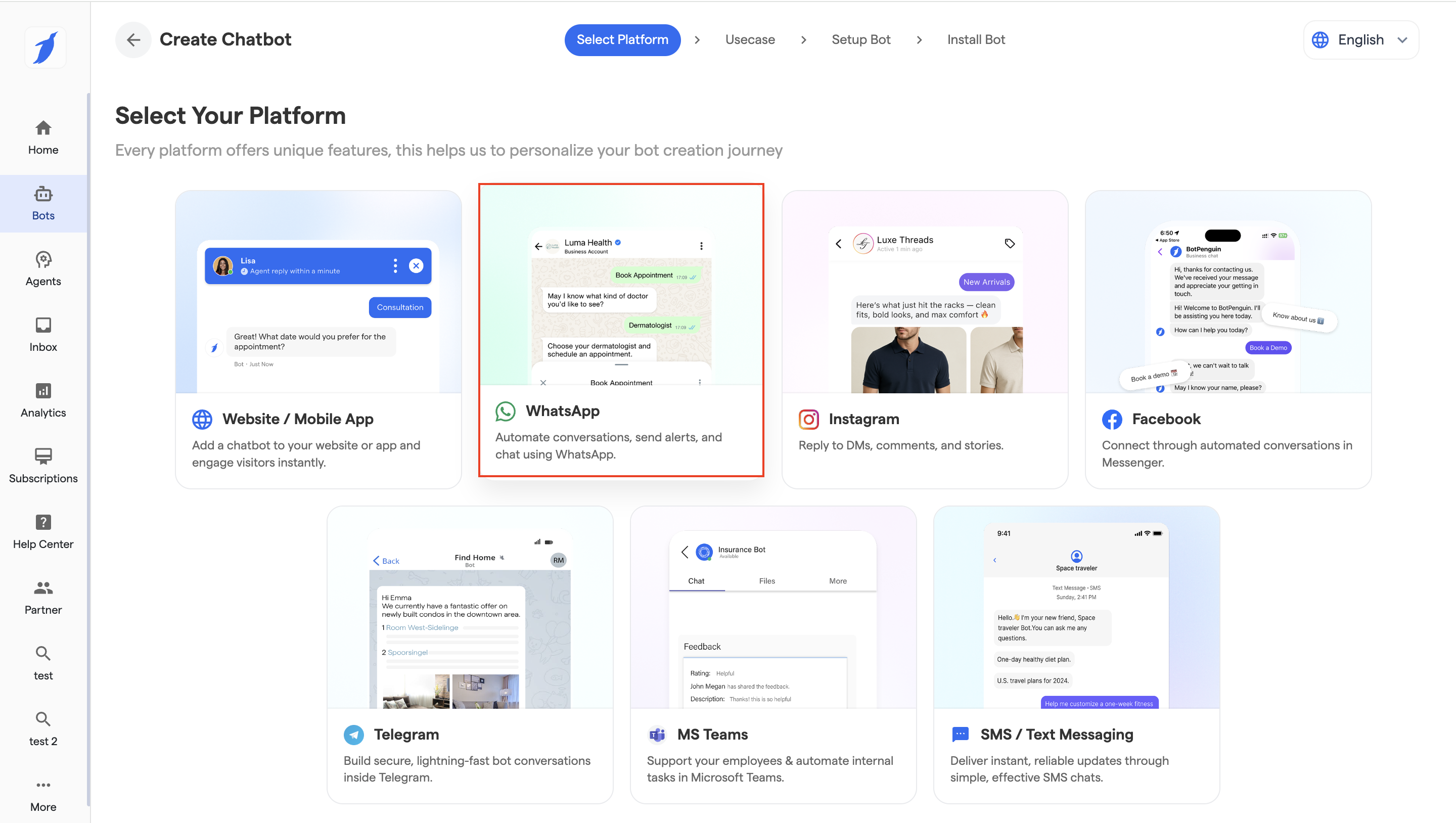 * To start with Click on the Create Bot Button and Select the Whatsapp option .