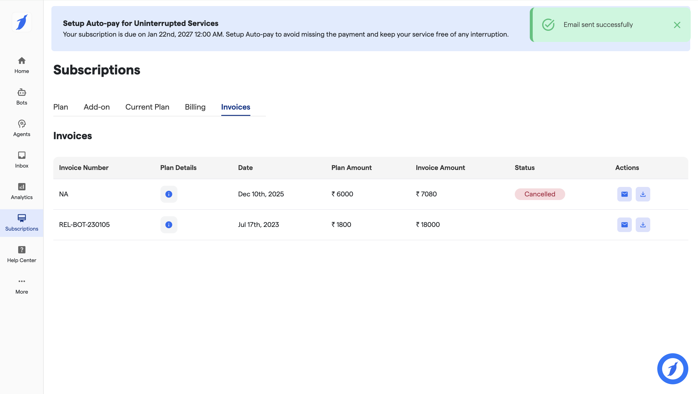 * Clicking on "**Email"** icon will send the invoices directly to your email Address.