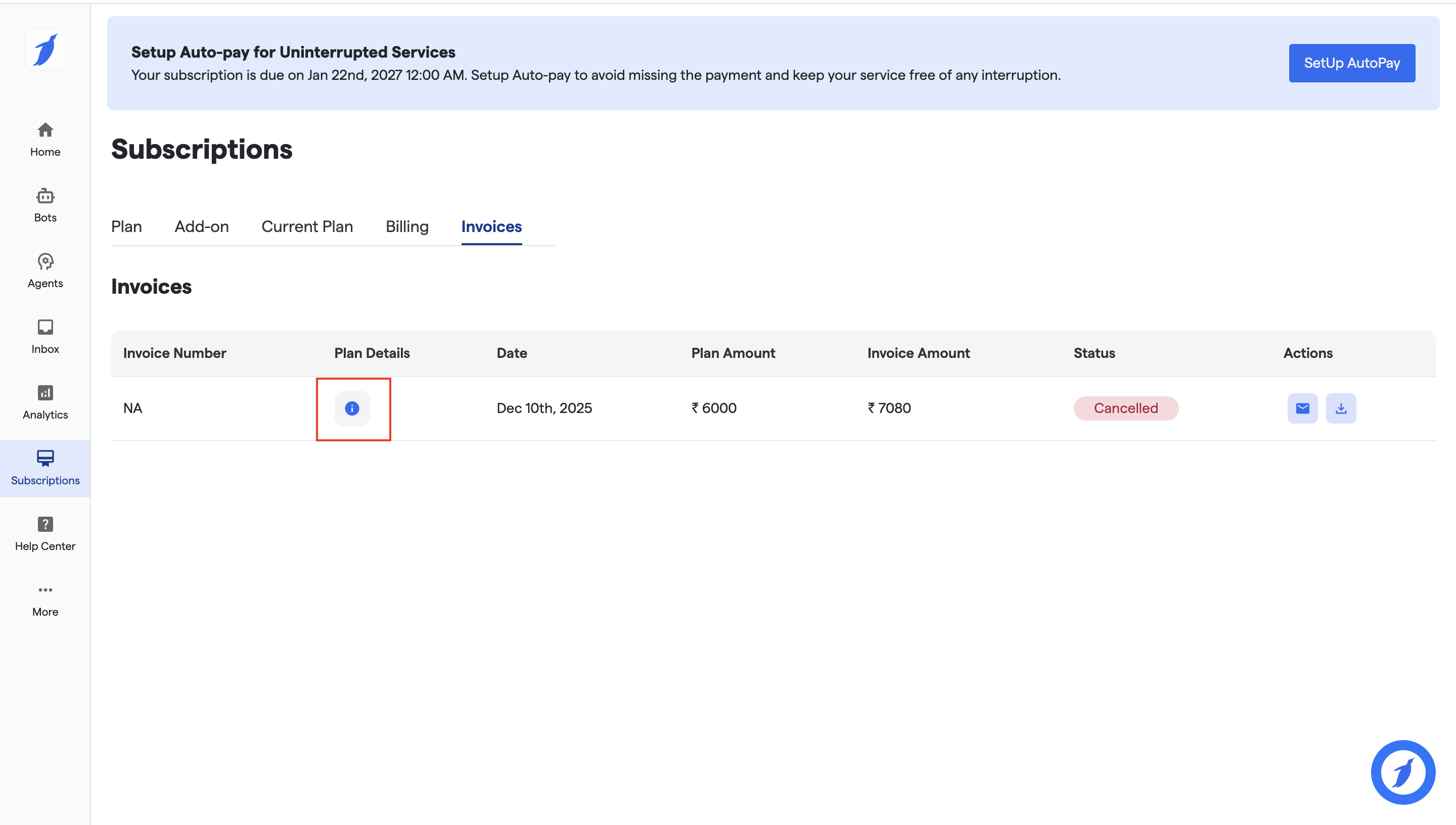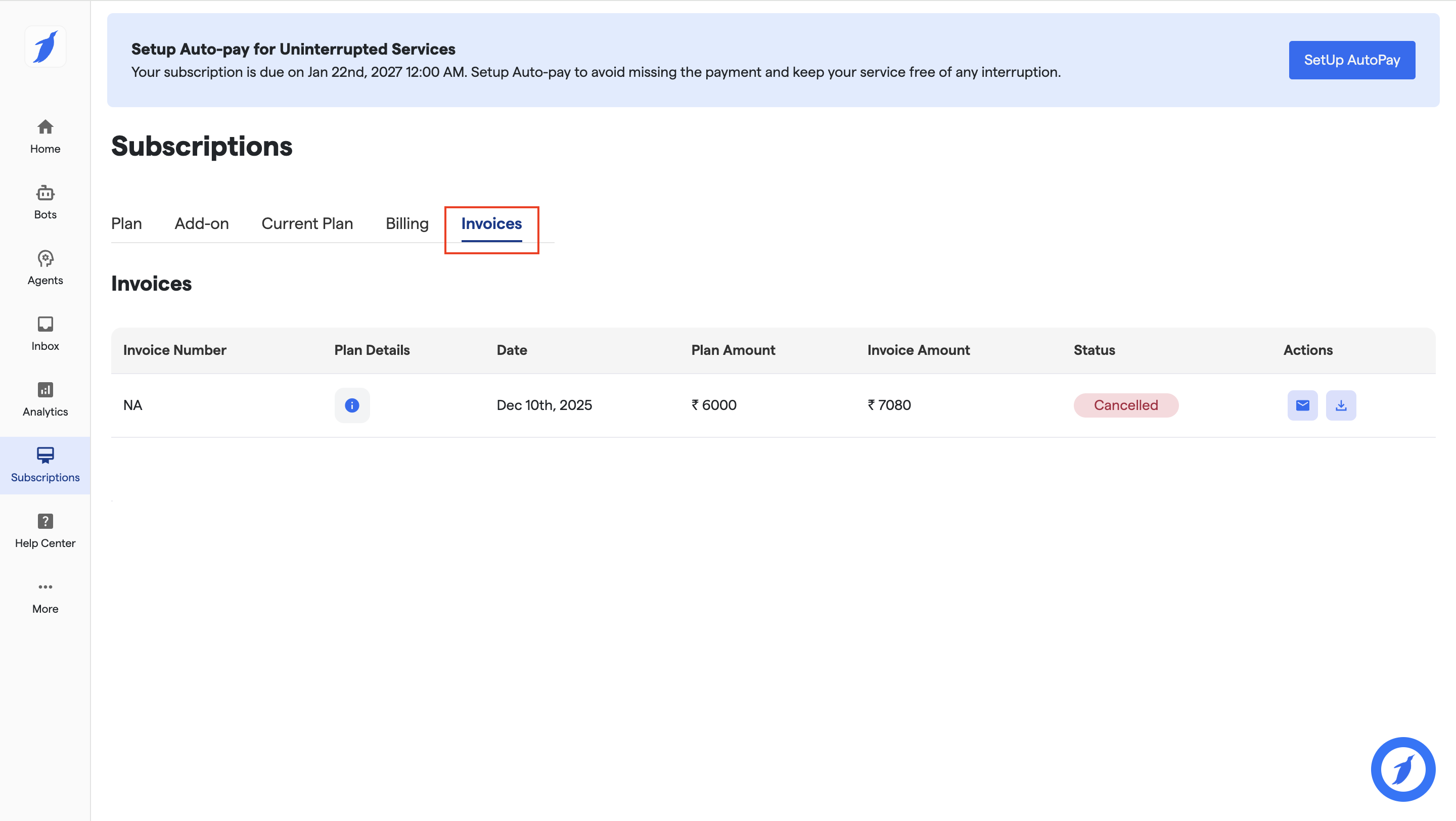 The **Invoices** tab displays all invoices generated for your subscriptions and add-ons.